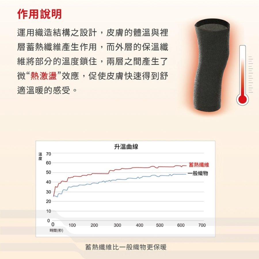● 運用具有蓄熱升溫功能之紗線材料綿密編織於織物裡層 藉由與皮膚的溫度產生”熱激盪”達到增溫保暖的效果