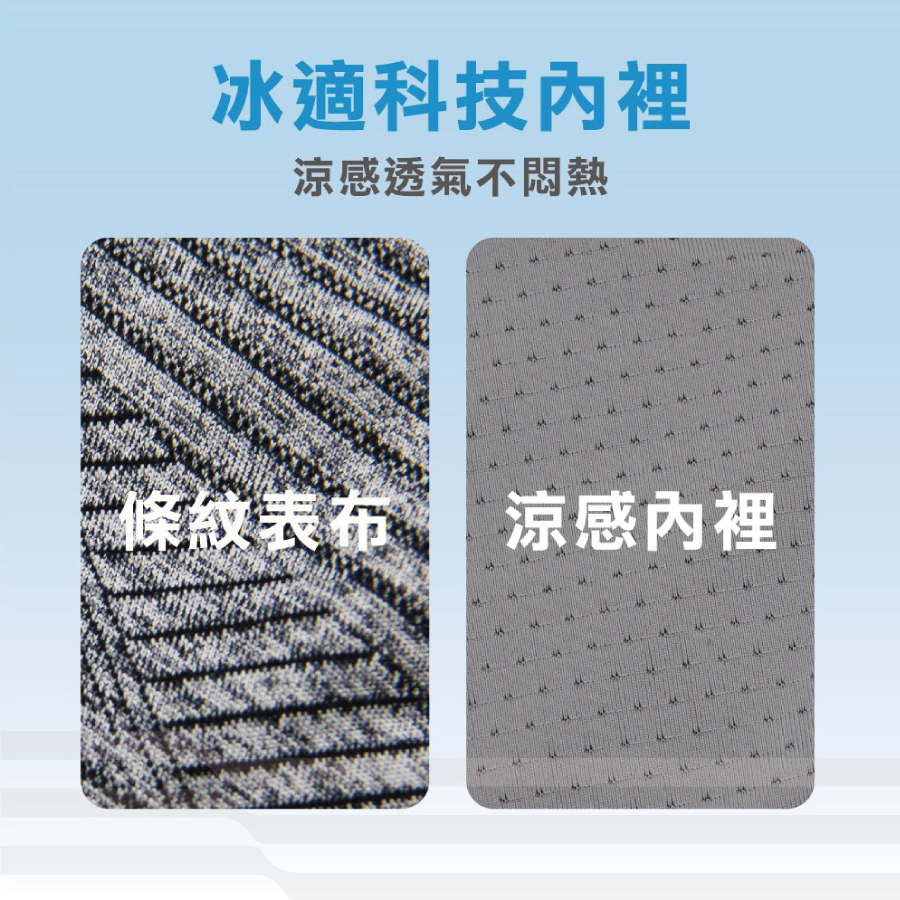 ● 採用冰適涼感紗+彈力親膚布料,貼合不緊繃