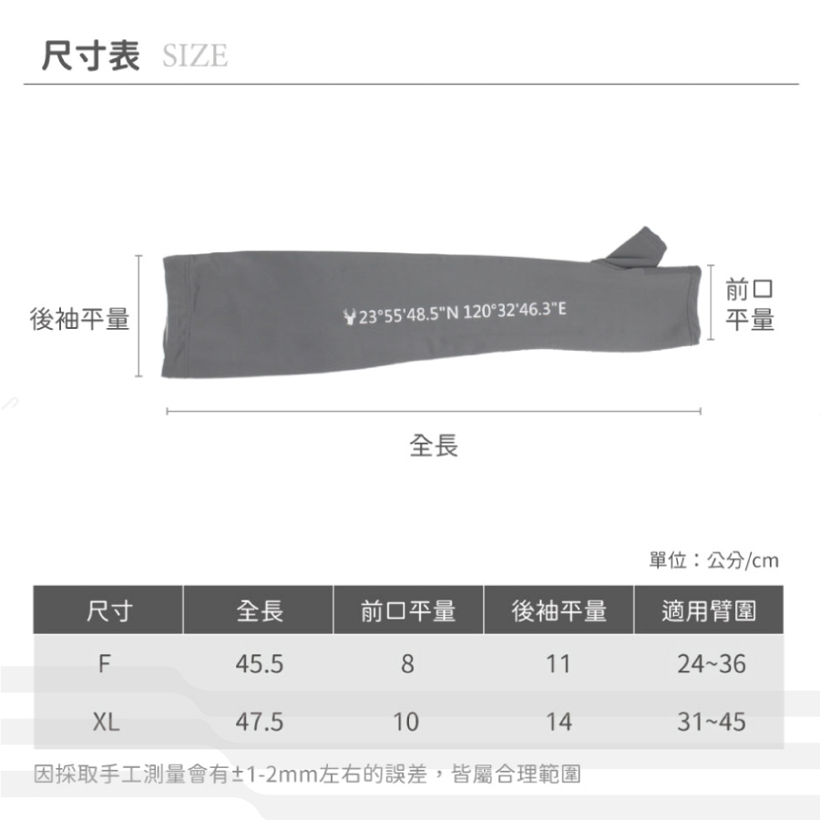 ● 尺寸:F (全長45.5 / 前口平量8 / 後袖平量11 / 適用臂圍24-36cm) / XL(全長47.5 / 前口平量10 / 後袖平量14 / 適用臂圍31-45cm)