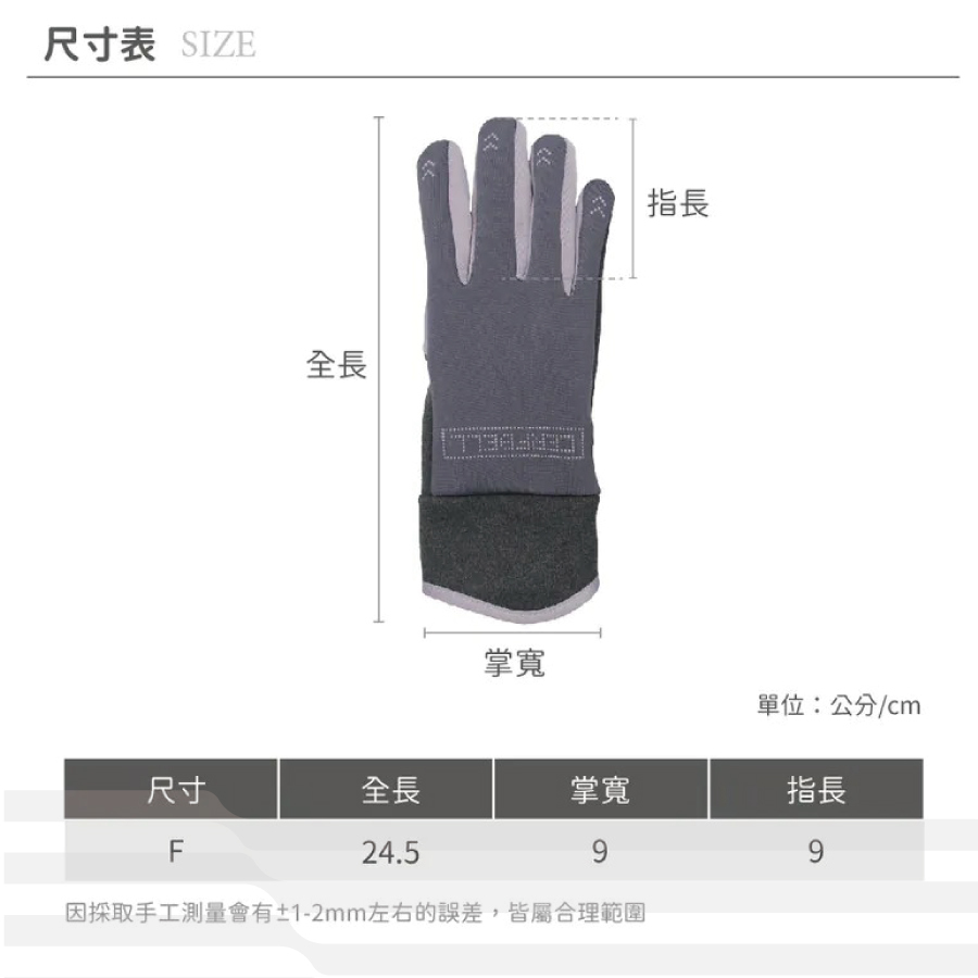 ● 尺寸:F (全長:24.5 / 掌寬:9 / 指長:9cm)