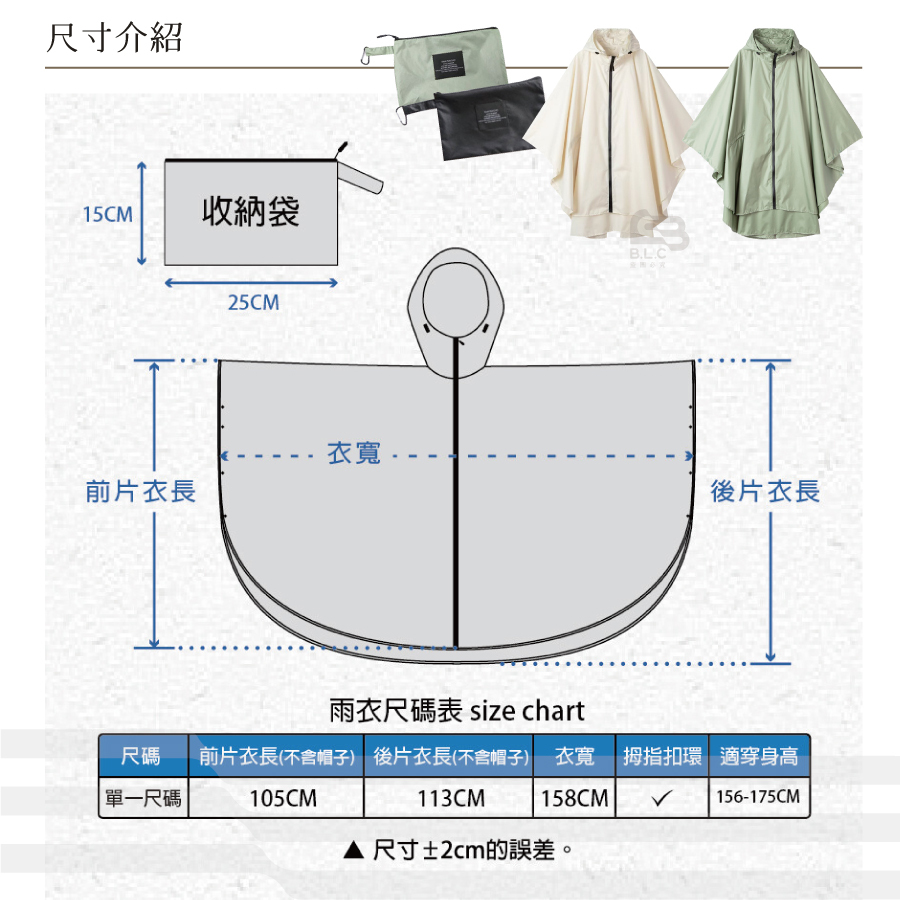 ● 尺寸:F 前面衣長:105cm(不含帽子) / 後面衣長:113cm(不含帽子) / 衣寬:158cm / 適穿身高:156-175cm